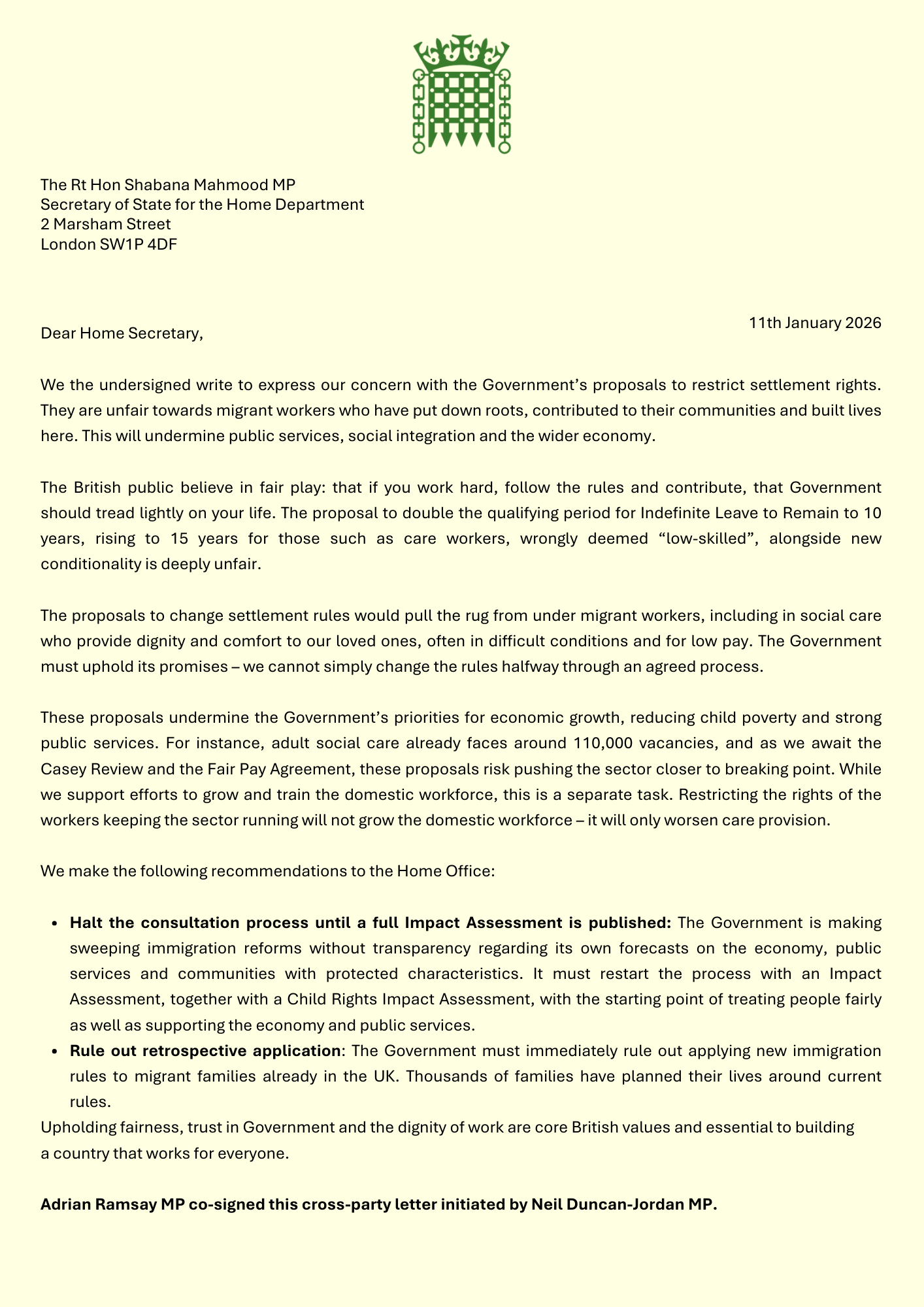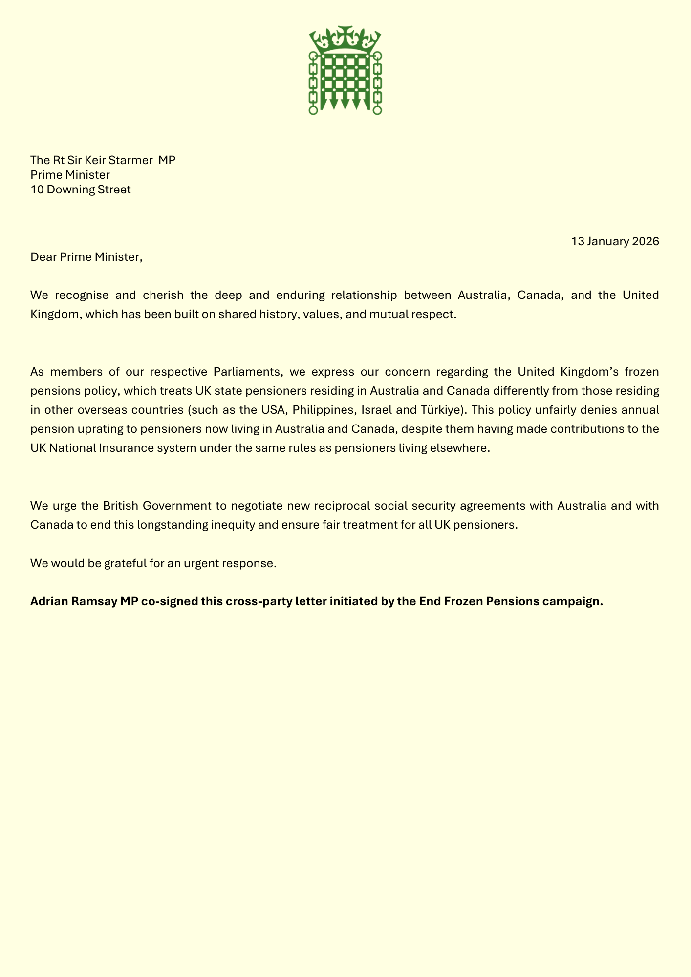 Adrian Ramsay MP co-signed this cross-party letter initiated by Rt Hon Jeremy Corbyn MP.