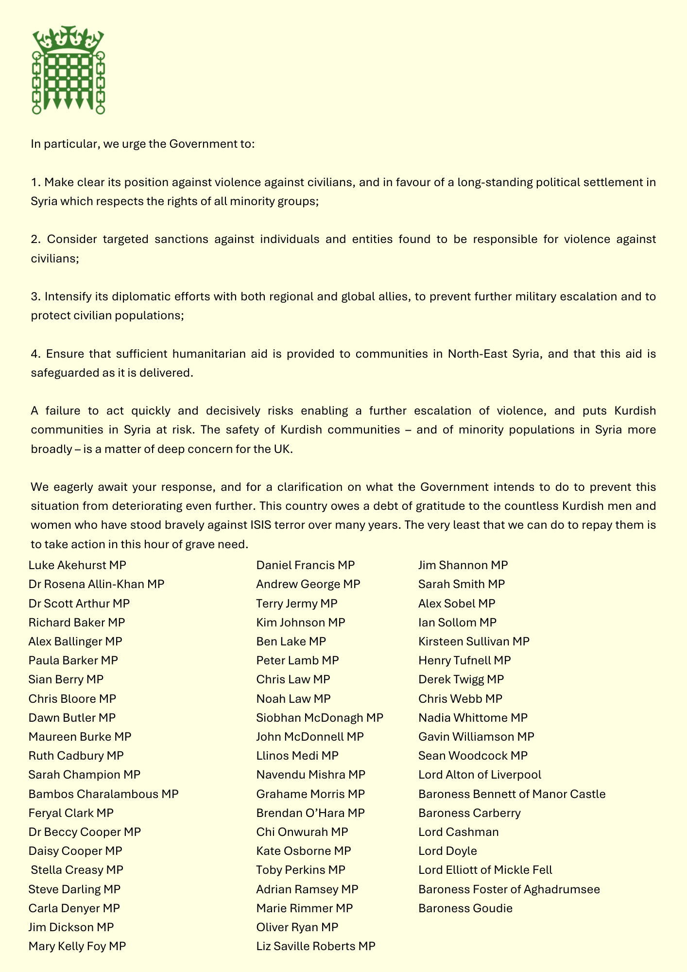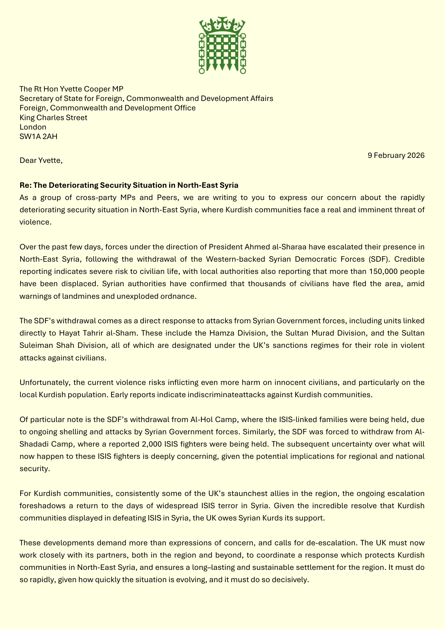 As a group of cross-party MPs and Peers, we are writing to you to express our concern about the rapidly deteriorating security situation in North-East Syria, where Kurdish communities face a real and imminent threat of violence.