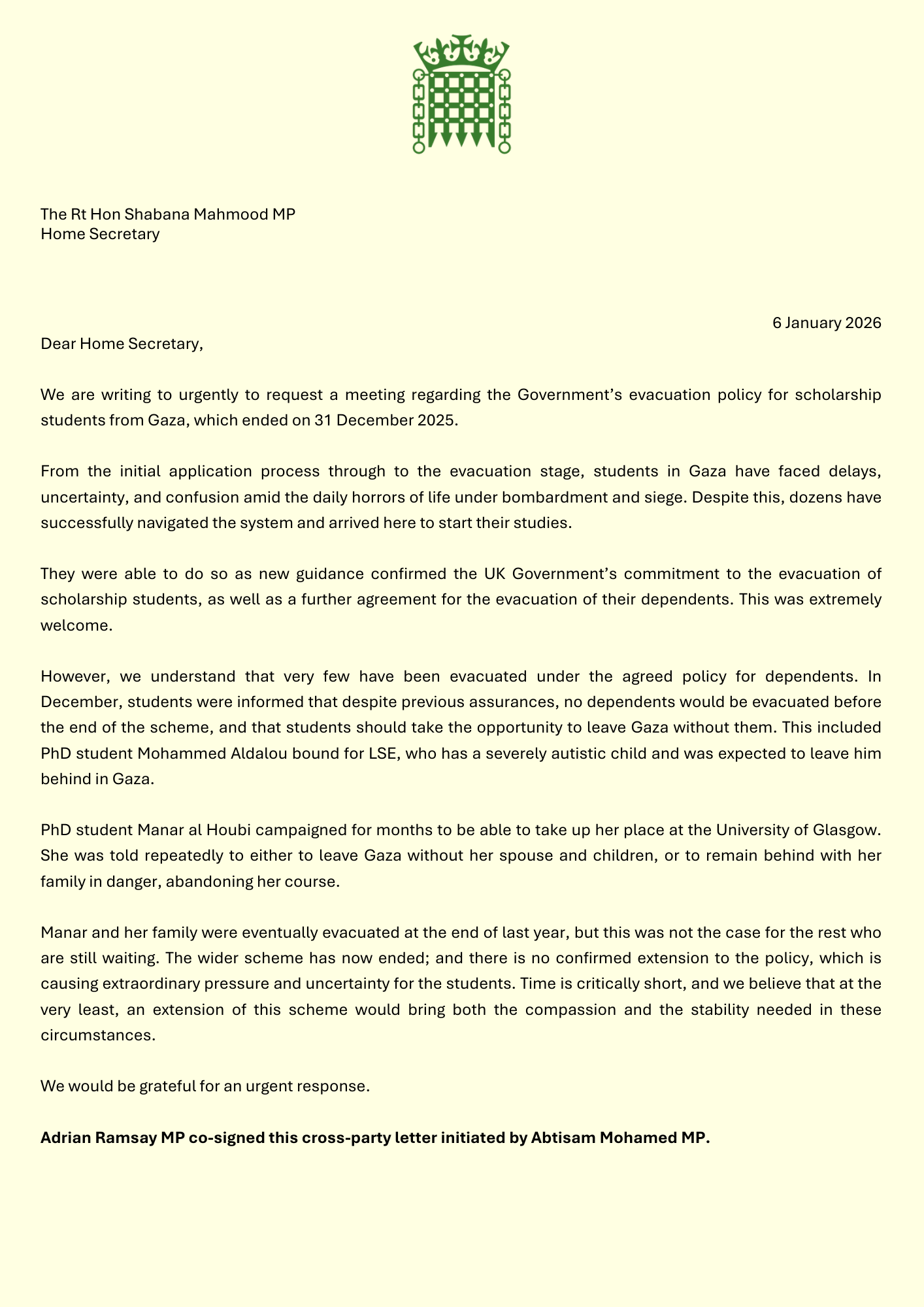Adrian Ramsay MP co-signed this cross-party letter initiated by Luke Akehurst MP.