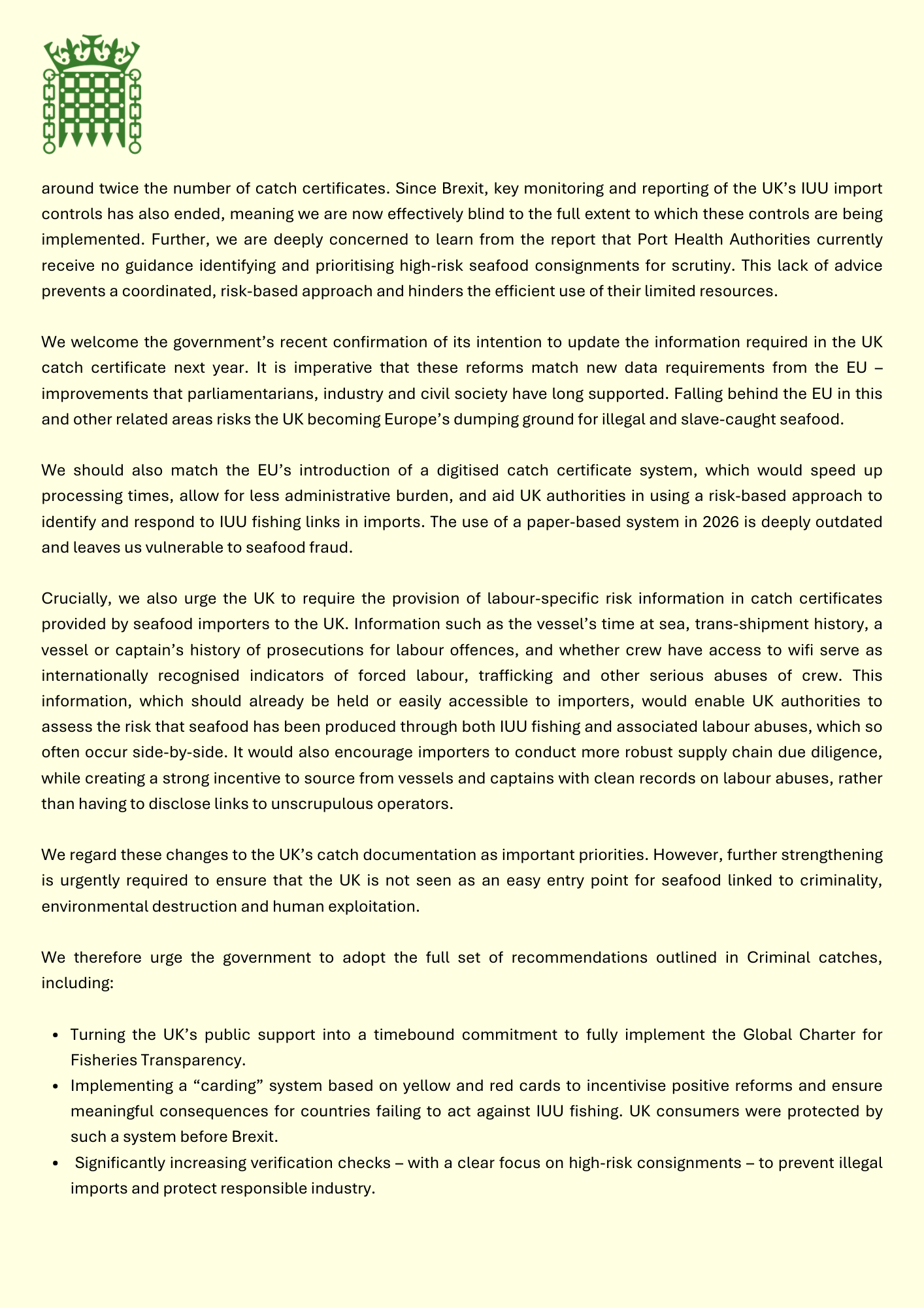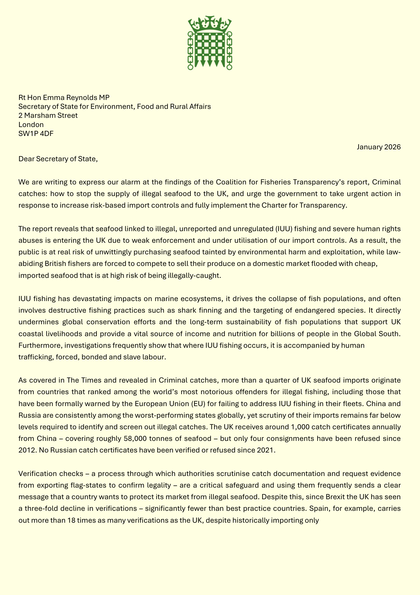 We are writing to express our alarm at the findings of the Coalition for Fisheries Transparency’s report, Criminal catches: how to stop the supply of illegal seafood to the UK, and urge the government to take urgent action in response to increase risk-based import controls and fully implement the Charter for Transparency.