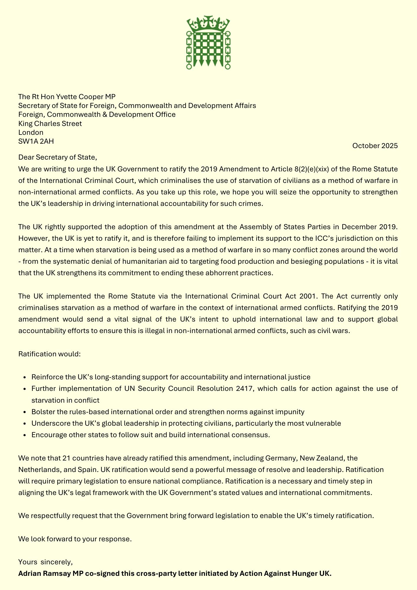 We are writing to urge the UK Government to ratify the 2019 Amendment to Article 8(2)(e)(xix) of the Rome Statute of the International Criminal Court, which criminalises the use of starvation of civilians as a method of warfare in non-international armed conflicts. As you take up this role, we hope you will seize the opportunity to strengthen the UK’s leadership in driving international accountability for such crimes.