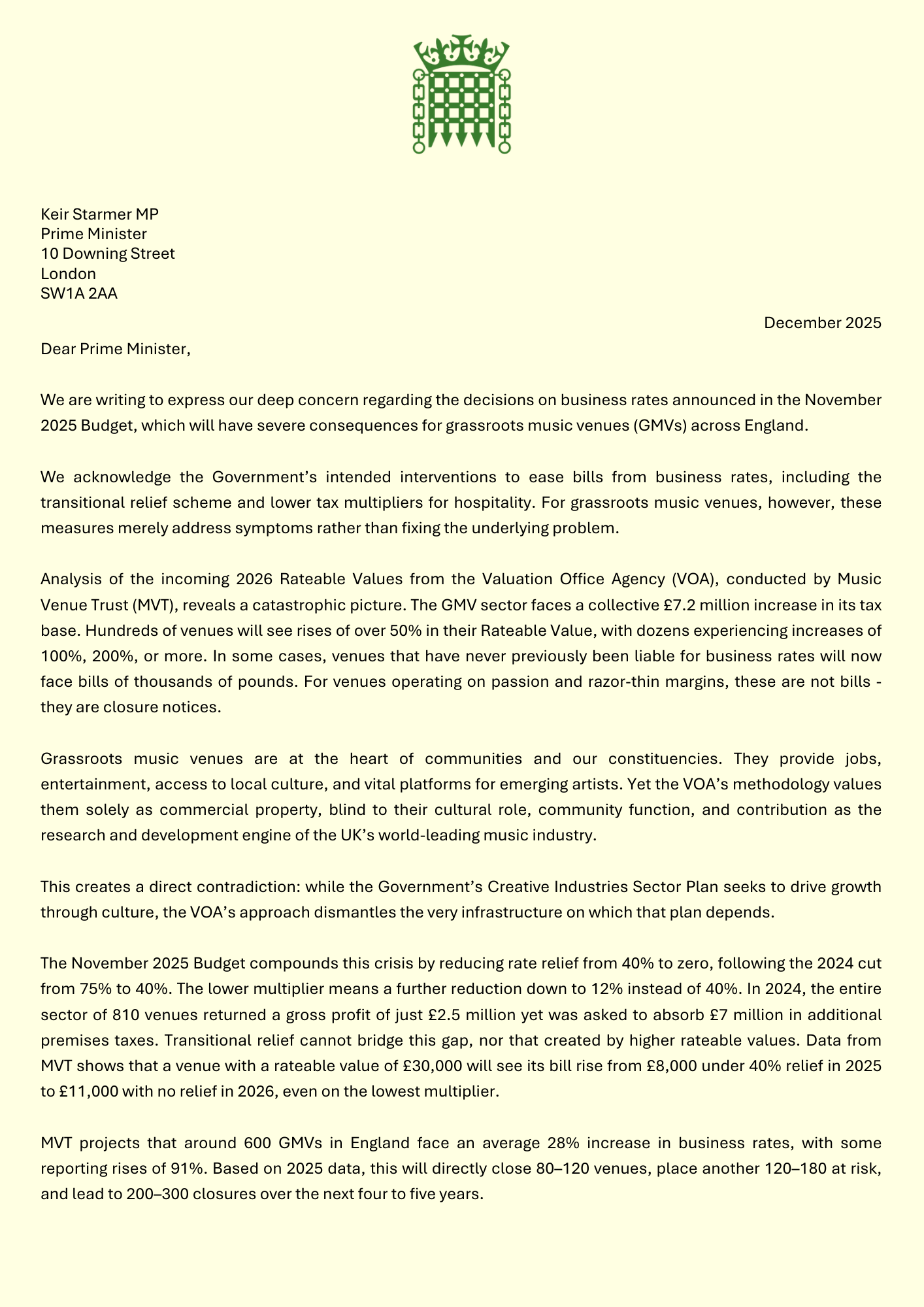 We are writing to express our deep concern regarding the decisions on business rates announced in the November 2025 Budget, which will have severe consequences for grassroots music venues (GMVs) across England.