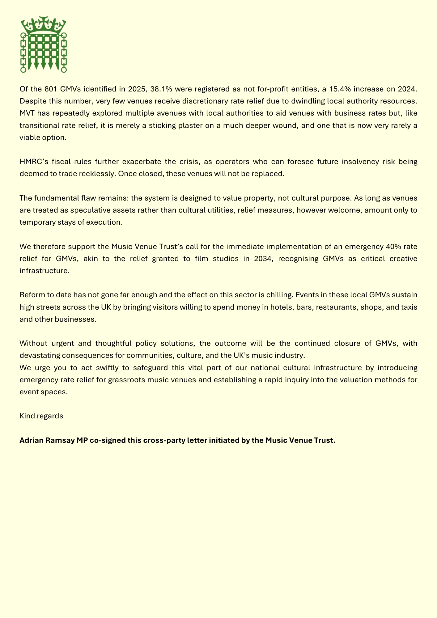 We urge you to act swiftly to safeguard this vital part of our national cultural infrastructure by introducing emergency rate relief for grassroots music venues and establishing a rapid inquiry into the valuation methods for event spaces.