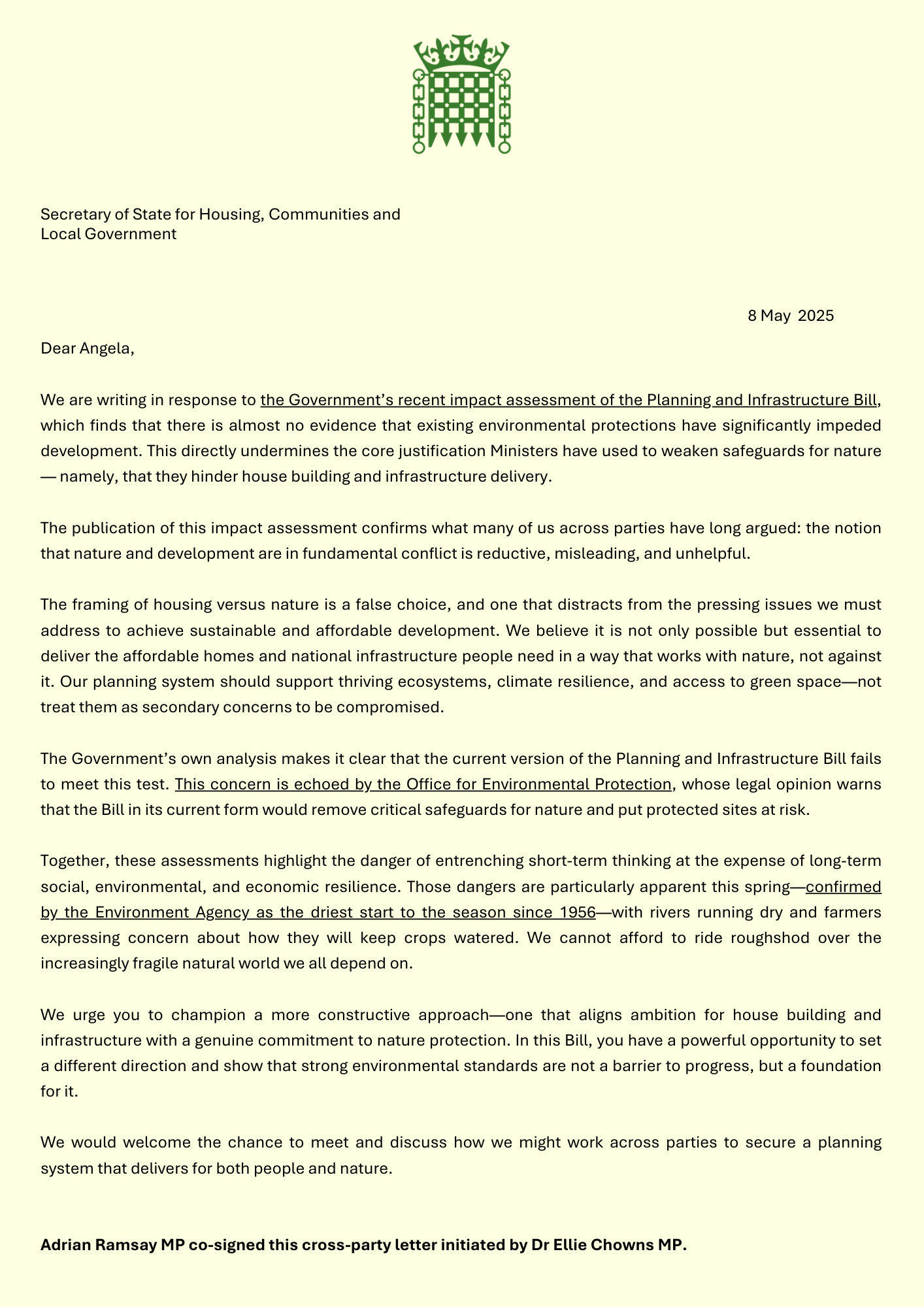 Adrian Ramsay MP co-signed this cross-party letter initiated by Dr Ellie Chowns MP.