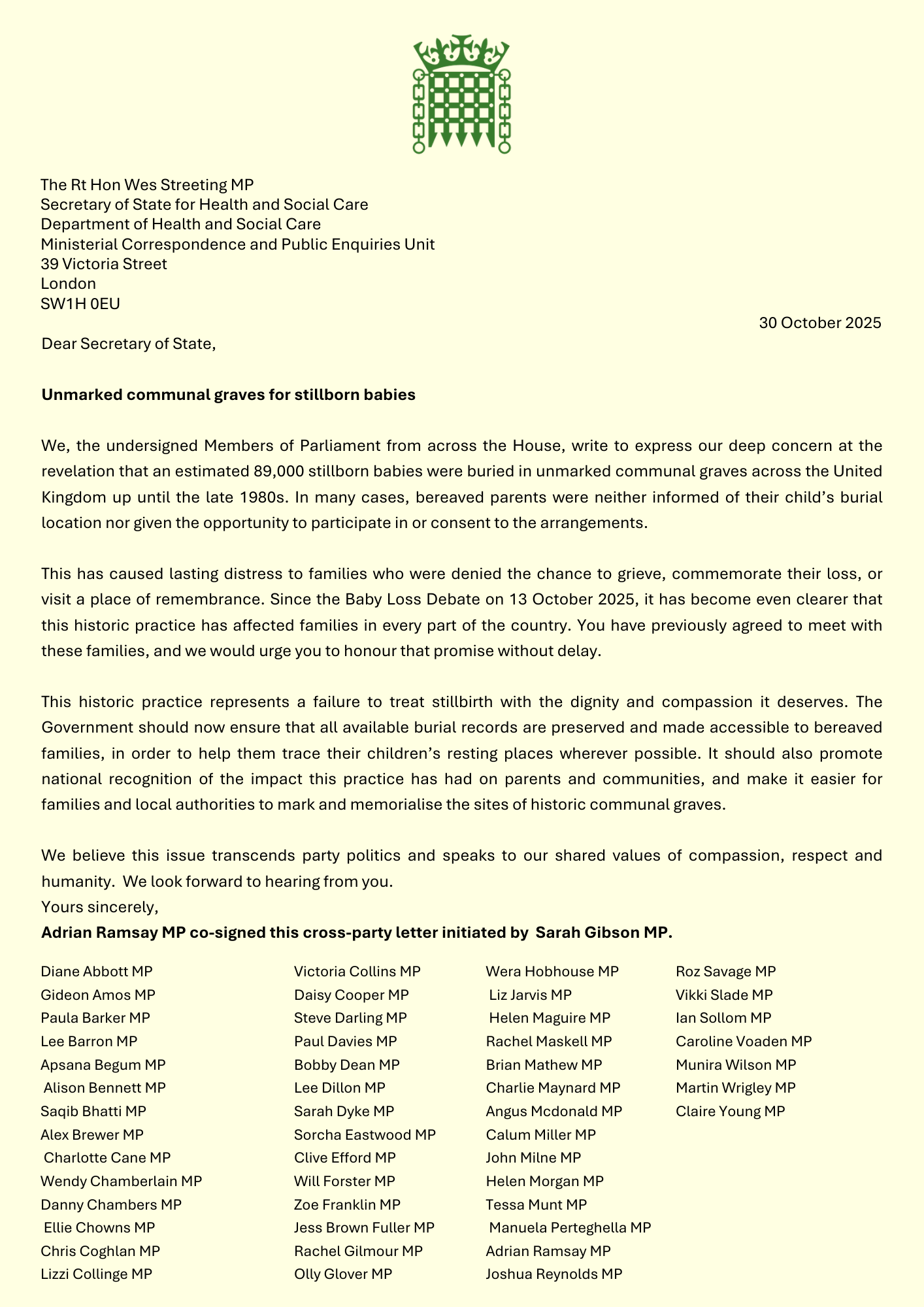 We, the undersigned Members of Parliament from across the House, write to express our deep concern at the revelation that an estimated 89,000 stillborn babies were buried in unmarked communal graves across the United Kingdom up until the late 1980s. In many cases, bereaved parents were neither informed of their child’s burial location nor given the opportunity to participate in or consent to the arrangements.