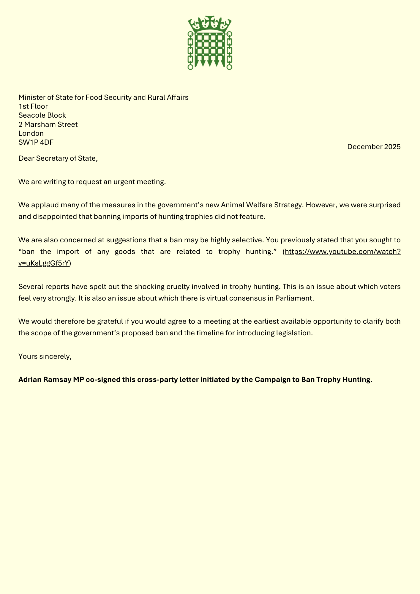 Adrian Ramsay MP co-signed this cross-party letter initiated by the Campaign to Ban Trophy Hunting.