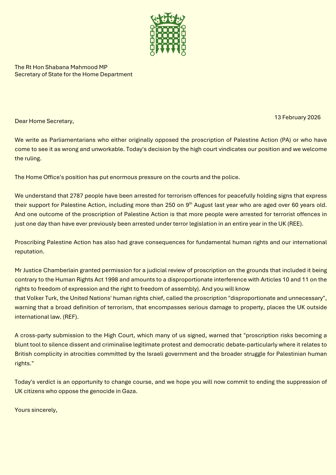 Letter to the Secretary of State for the Home Department on proscription of Palestine Action