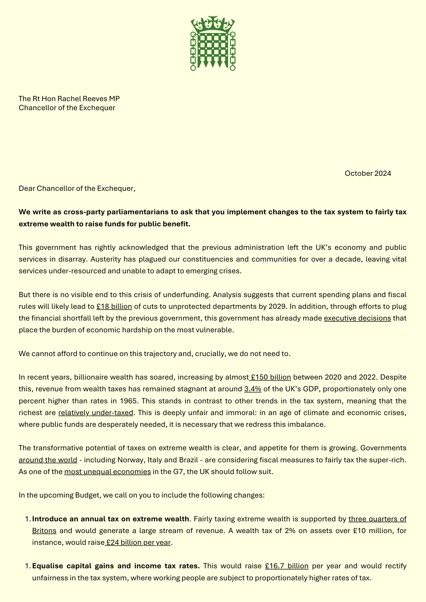We write as cross-party parliamentarians to ask that you implement changes to the tax system to fairly tax extreme wealth to raise funds for public benefit.