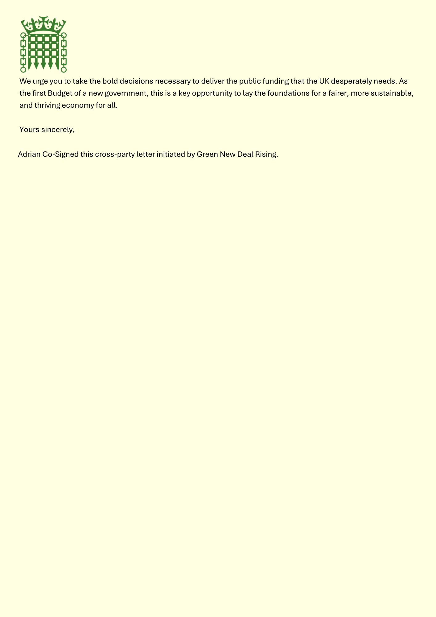 Adrian Co-Signed this cross-party letter initiated by Green New Deal Rising.