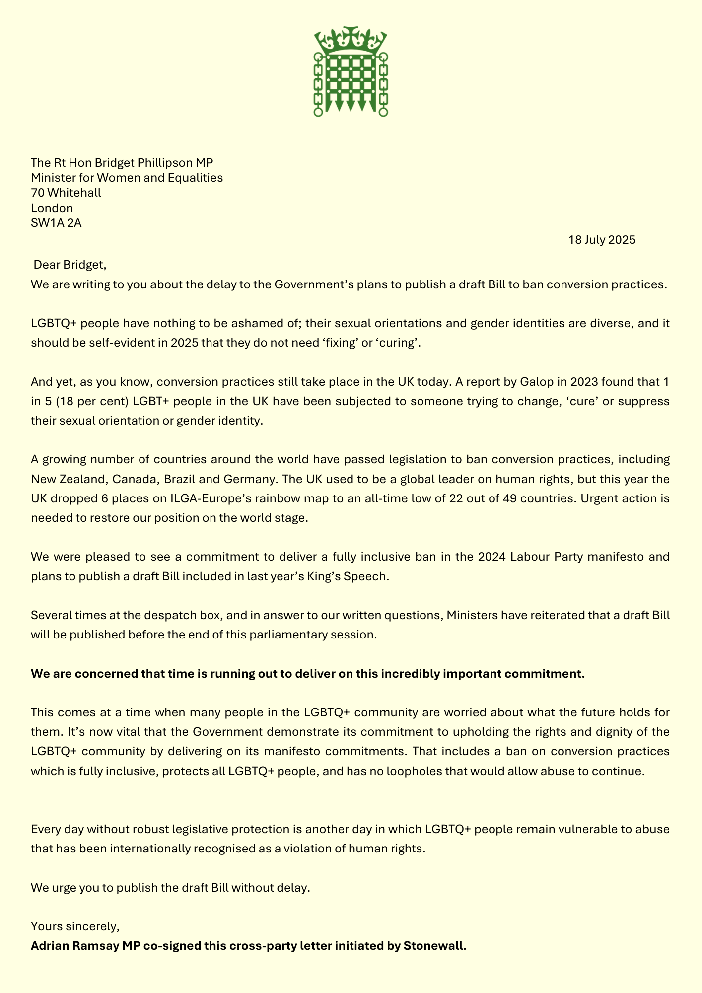 Adrian Ramsay MP co-signed this cross-party letter initiated by Stonewall.