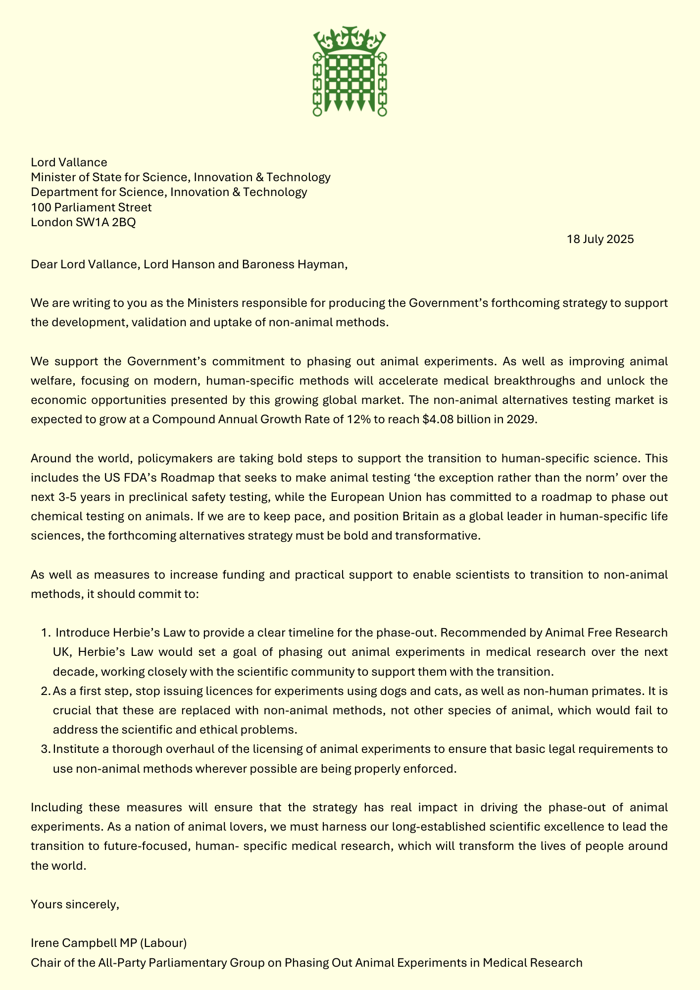 Cross-party letter on phasing out animal experiments