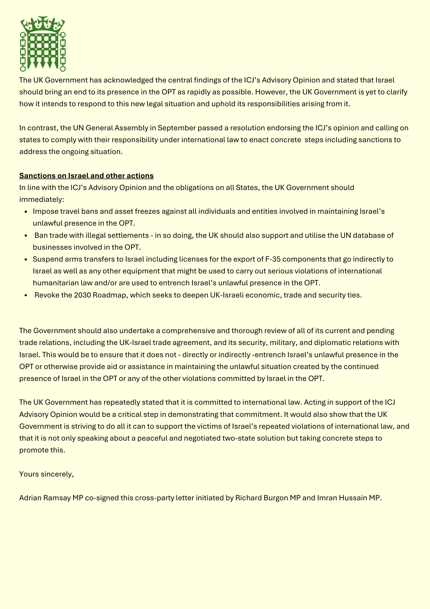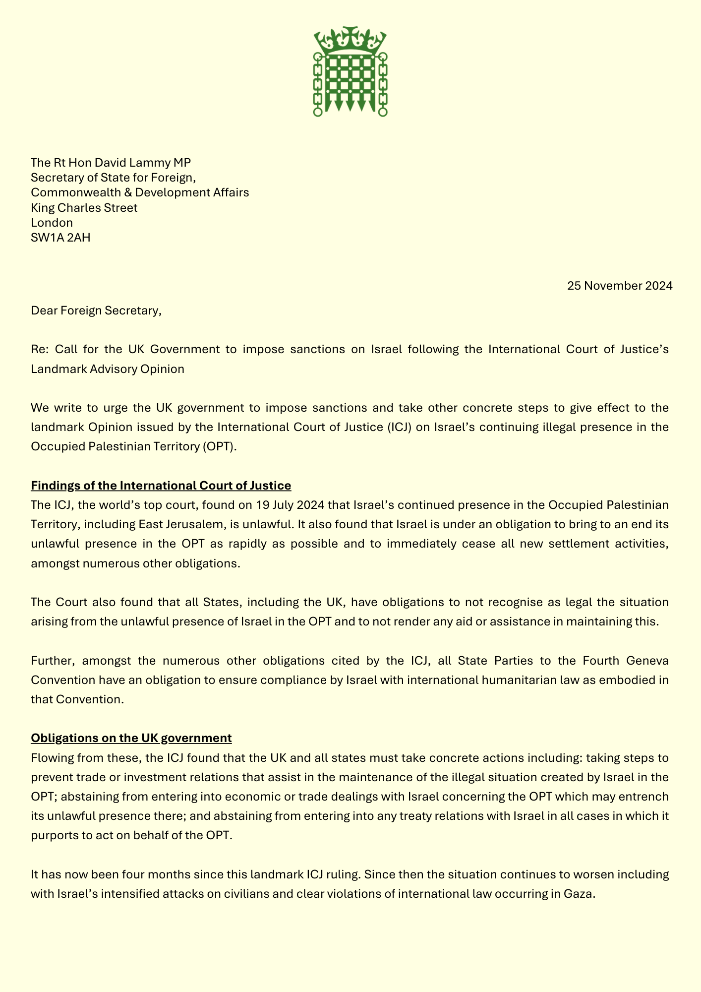 We write to urge the UK government to impose sanctions and take other concrete steps to give effect to the landmark Opinion issued by the International Court of Justice (ICJ) on Israel’s continuing illegal presence in the Occupied Palestinian Territory (OPT).