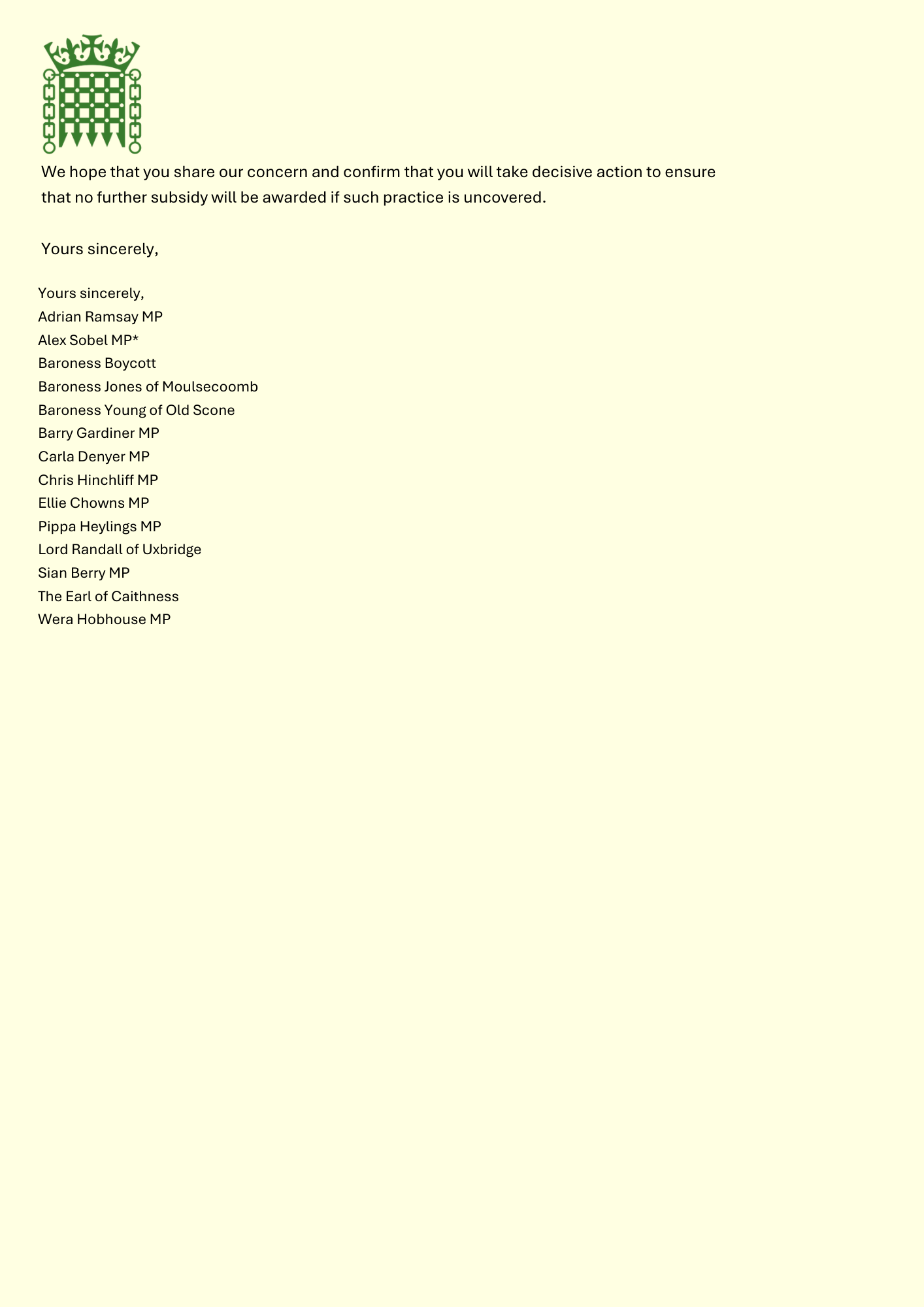Given that the Financial Conduct Authority are currently investigating such “historical statements” made by Drax about their sourcing of pellets, we request that all future UK government contracts with Drax be suspended for the duration of this investigation. We ask you to clarify whether your Department considers Drax to be currently meeting the standards of transparency and compliance expected of a recipient of public subsidy.