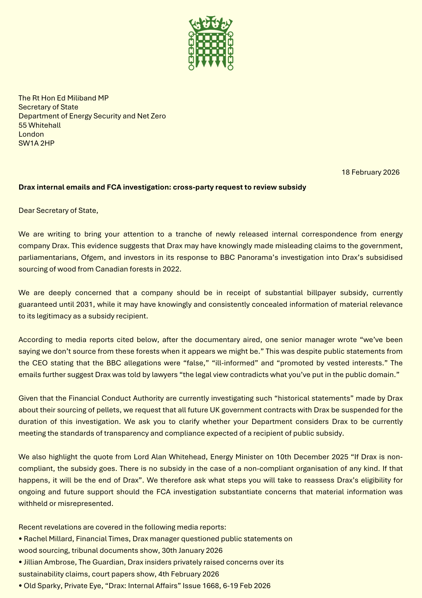 We are writing to bring your attention to a tranche of newly released internal correspondence from energy company Drax. This evidence suggests that Drax may have knowingly made misleading claims to the government, parliamentarians, Ofgem, and investors in its response to BBC Panorama’s investigation into Drax’s subsidised sourcing of wood from Canadian forests in 2022.