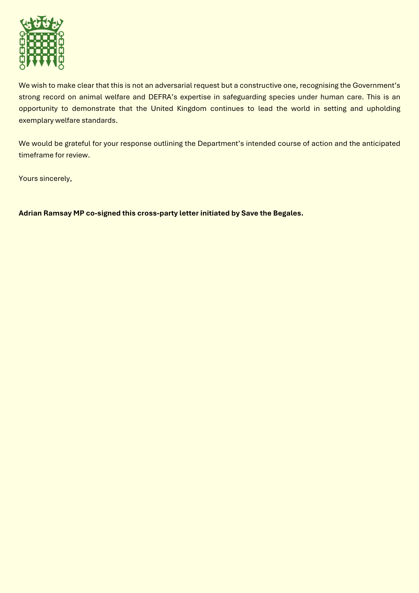 We wish to make clear that this is not an adversarial request but a constructive one, recognising the Government’s strong record on animal welfare and DEFRA’s expertise in safeguarding species under human care. This is an opportunity to demonstrate that the United Kingdom continues to lead the world in setting and upholding exemplary welfare standards.
