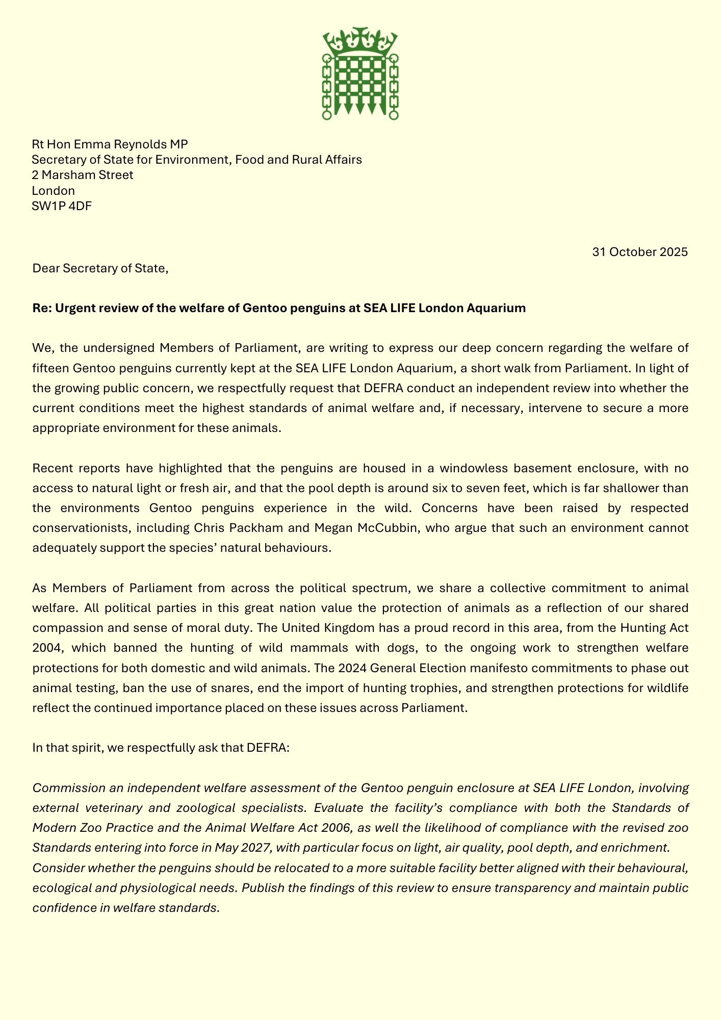 We, the undersigned Members of Parliament, are writing to express our deep concern regarding the welfare of fifteen Gentoo penguins currently kept at the SEA LIFE London Aquarium, a short walk from Parliament. In light of the growing public concern, we respectfully request that DEFRA conduct an independent review into whether the current conditions meet the highest standards of animal welfare and, if necessary, intervene to secure a more appropriate environment for these animals.