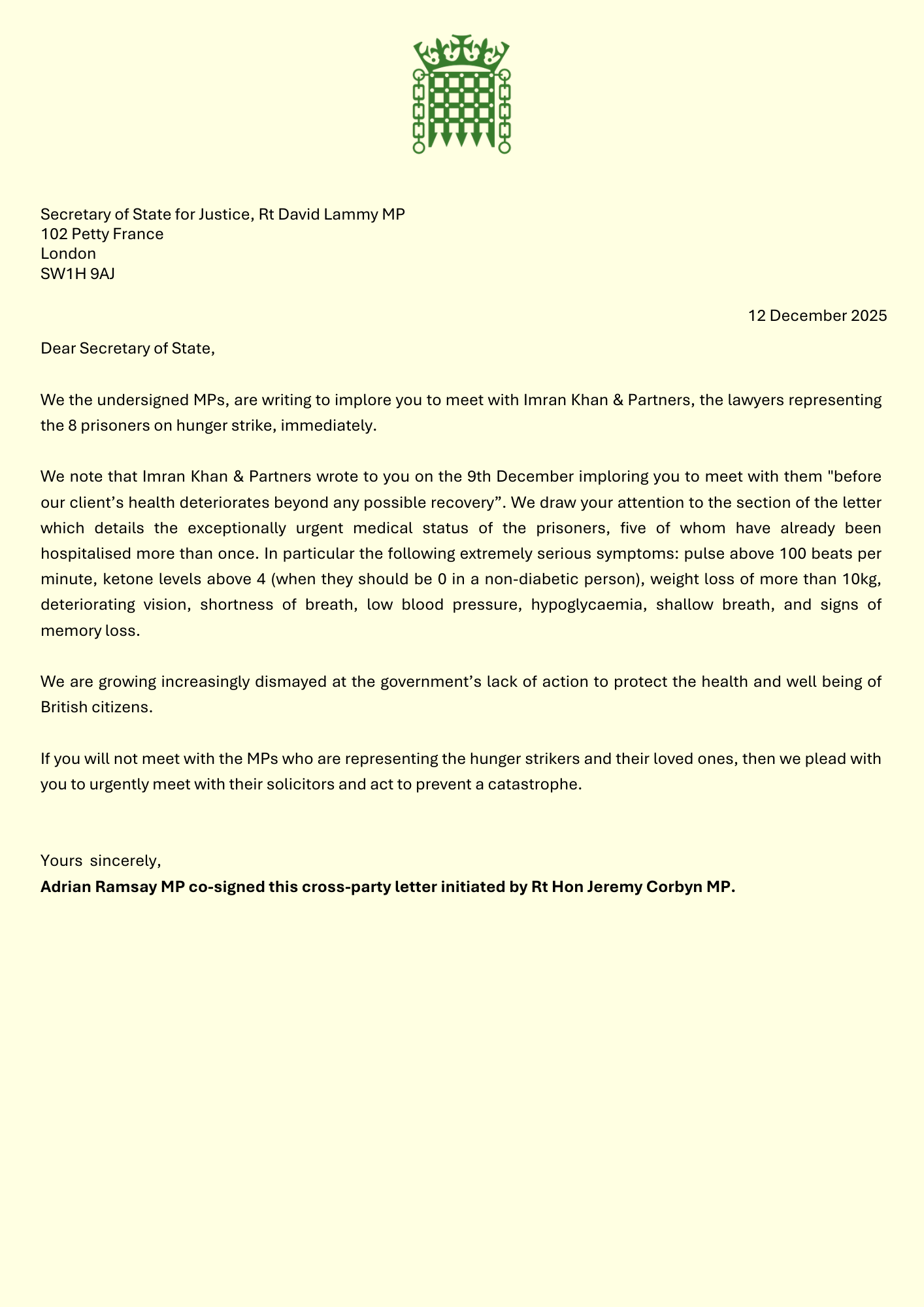 We the undersigned MPs, are writing to implore you to meet with Imran Khan & Partners, the lawyers representing the 8 prisoners on hunger strike, immediately.